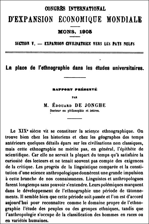 Congrès International d’expansion économique mondiale tenu à Mons du 24 au 28 septembre 1905. La place de l’ethnographie dans les études universitaires – par E. De Jonghe.
